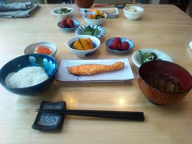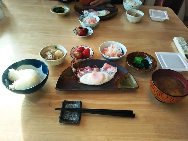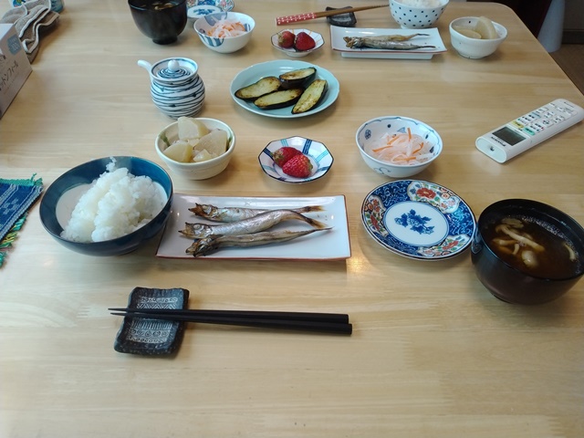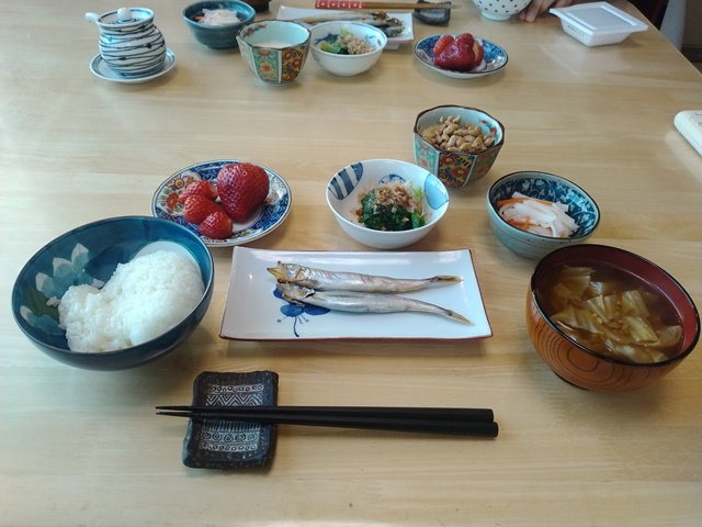 家にゴミ袋を持ち帰って、朝食の支度を手伝うのです。箸をテーブルに置いたら、小鉢に野菜の煮物を盛りつけて運ぶ。小皿にイチゴを載せてやはりテーブルへ。女将が起きだして来て、「今日は卵でも焼きましょうかね」と言う。魚がシシャモだけだから少しおかずが足りないと思ったのでしょう。亭主は今朝炊いたご飯を盛りつけて、卵とシシャモもテーブルに運んだら、女将のよそってくれた味噌汁をカウンター越しに受け取るのです。