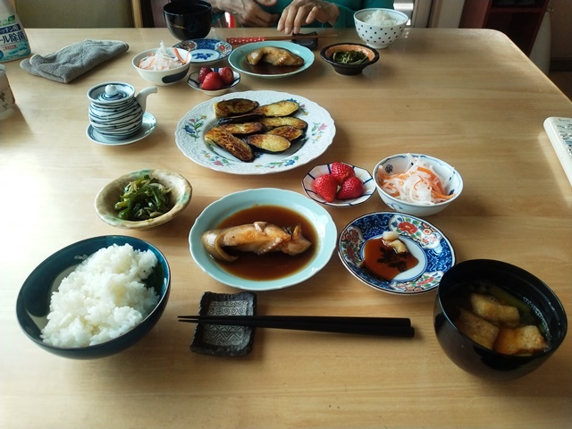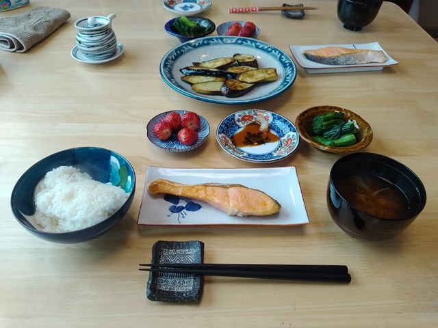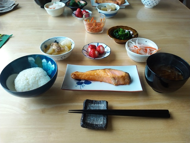 女将が起き出して来て厨房に入ったので、亭主は小鉢に大根と人参の鱠や鶏肉と大根の煮物を盛り付けて、苺を小皿に載せてテーブルに運ぶ。茄子焼きが焼き上がるまでに、ご飯を茶碗によそって茄子焼きの醤油皿を用意するのです。味噌汁を女将が椀に盛り付けたところで、鰺の開きが焼き上がったので、席に着いて女将の座るのを待つ。今日の朝食もおかずが多いのです。鰺は賞味期限が近づいているので、やはり少し塩辛くなっていた。