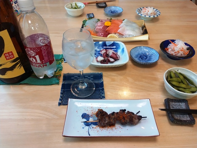 4時半を過ぎたら今日の晩酌の支度を始める亭主。冷凍してあったハラミの串焼きを一本だけ解凍して、グリルに入れて焼き始めるのです。テレビでは『ジマンジ』という娯楽冒険映画をやっていたので、懐かしく観ながら枝豆を解凍して、ちびりちびりと酒を飲む。女将が鱠と蒸し蛸の小鉢を揃えて出してくれた。最後に刺身の盛り合わせが出て、女将のご飯が出来上がったら、二人で夕食を始めるのでした。桜も観られていい一日だったのです。