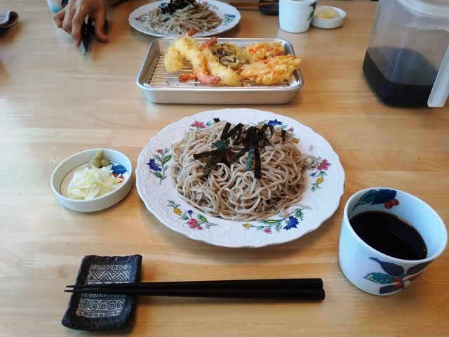 帰りは亭主が休み休みでないと帰れなさそうだったので、女将には先に帰ってもらい、歩く老人の休憩用に置かれている椅子に腰かけながら、ゆっくりと歩いて帰るのでした。さすがに今日は歩き疲れて、家に帰って時計を見ればもう10時半を過ぎていました。万歩計は7000歩を越えていたのです。それでも少し休んでから、亭主は厨房に入って蕎麦を茹で天ぷらを揚げる準備をして、野菜を刻み始める。久しぶりに美味しい蕎麦が食べられました。