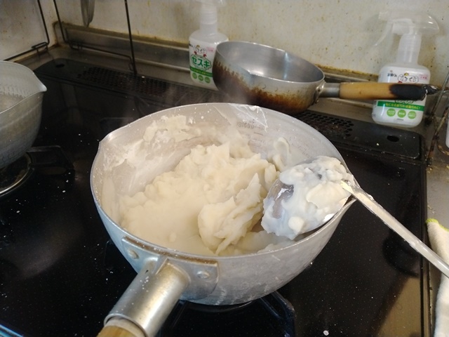 蕎麦打ち室に入って500gだけ蕎麦粉を計って捏ね始めた。ちょうど袋の中には蕎麦湯を作るだけの粉が残って、後は今日の蕎麦粉の配達を待つばかり。冷蔵庫で解凍してあった白餡を、水と砂糖で煮ている間に蕎麦粉を捏ねて、蕎麦玉を寝かせている間に厨房に戻って白餡作りの仕上げをするのでした。週の初めの昨日は苺大福が全部売れたから、今日はどうしても白餡を作らなければならなかったのです。タッパに詰めて冷蔵庫に入れておきます。