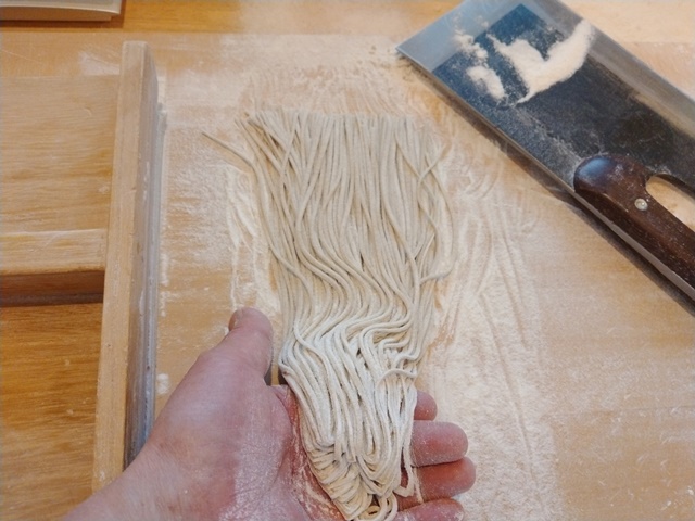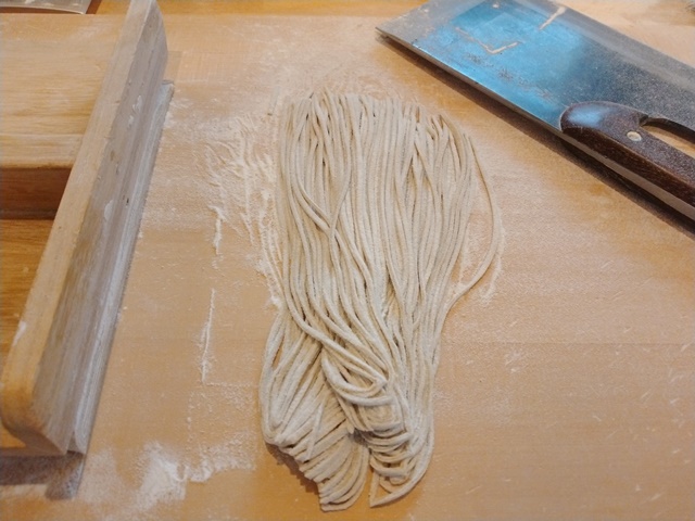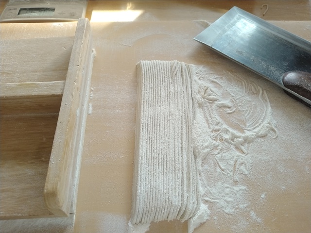 その間に厨房に入って、キャベツと胡瓜の浅漬けとなた漬けを盛り付け、蕎麦豆腐を仕込んでおきました。昨日は一人で二皿も蕎麦豆腐を頼んだ青年がいたので、あっという間に売り切れてしまったのてす。今週最後の営業日だったけれど、ヘルシーランチセットなどを頼まれた時に、蕎麦豆腐がないのでは困るのでした。蕎麦打ち室に戻って、生地を伸して畳んで包丁切り。加水率は43%で昨日と同じでした。時間をかけて粉と水を馴らして柔らかくする。