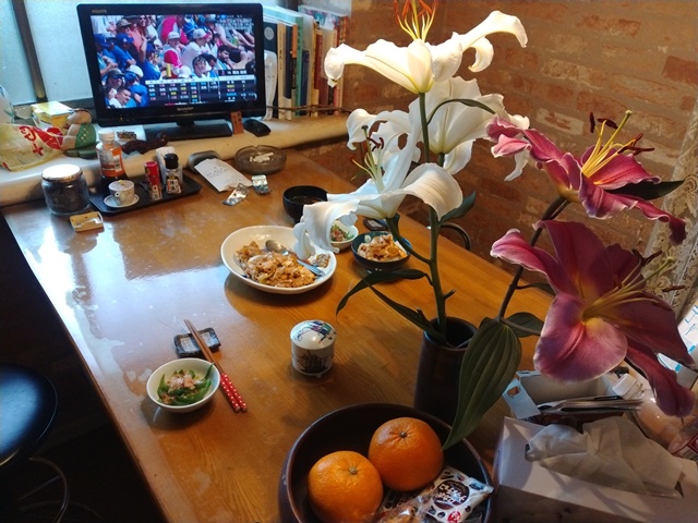 朝食の折に女将に話をすれば、「新しく買った入浴剤は、よく眠れると言うからいいんじゃない?」と言う。朝飯前に蕎麦屋に出掛けて、カウンターに干してあった昨日の洗い物を片付け、洗濯物を畳んだり、洗濯機の中の洗濯物を干したりする。家に帰ってMLBのドジャース戦をテレビで観ながら、朝食の親子丼を食べる。食卓のカサブランカも終わりの頃で、もう匂わなくなっている。十日間ほど楽しませてもらった。食後は書斎でひと眠りするのでした。