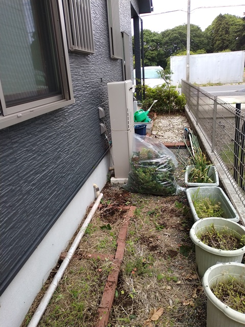 軍手をはめて90㍑のビニール袋を出し、玄関脇の花壇の周りを綺麗にしようと思ったのです。ところが、駐車場から飛んできた種から芽を出したモミジが、大きくなって葉を広げていたのでこれを切り、駐車場側に向かって伸びていたツツジも枝か伸びすぎていたので、これを切って地面の草を取っただけで、もう袋は一杯なのでした。所要時間は約40分。もう一袋は無理なので、今日はこれで終わりにしました。僅か一坪ほどの掃除で疲れてしまいました。