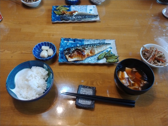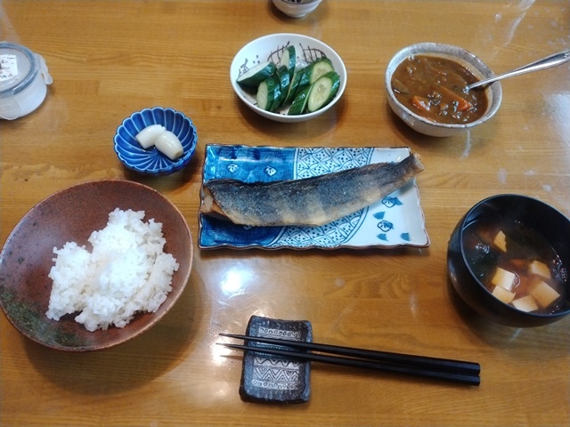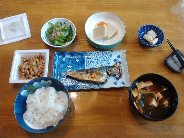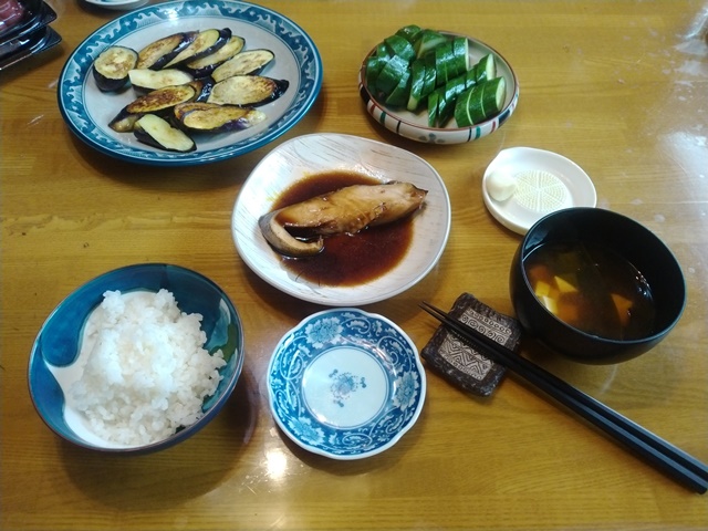 夕べも変則的な睡眠で、今朝は昨日の悪い眠り方を引きずってしまった。夜中に目が覚めて、明け方にまた眠り、朝食の時間に再び目覚めたのです。「グレイトネイチャー」とか「空からの絶景」などの心安らぐテレビ番組があると好いのですが、見るものがないと眠くならないので、最後のひと束の蕎麦を茹でて明け方に食べる。食べたらやはり眠くなるから、やっと熟睡出来るのでした。目覚めて食べる朝食は、亭主の好きな茄子焼きと銀ダラの煮付けです。