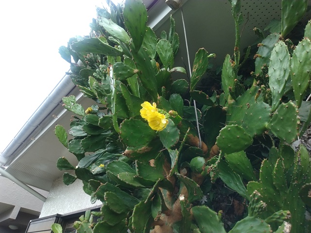 食事を終えて着替えもせずに、昨日袋に詰めた枝の葉を車に積んで、蕎麦屋に向かうのです。家の食用油がなくなったというので、蕎麦屋に残っている一斗缶の胡麻油と綿実油を入れる1㍑の容器を持って、曇り空の生暖かい風の中を車を走らせる。玄関脇のウチワサボテンが随分と切り詰めたのに、軒下の辺りにまた花を咲かせているのでした。このサボテンは最後に切り倒そうと考えている。棘が飛んで肌に刺さるとなかなか取れないから厄介なのです。