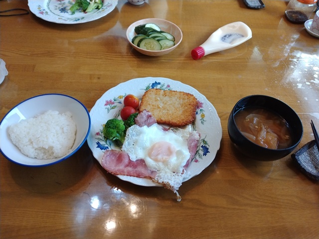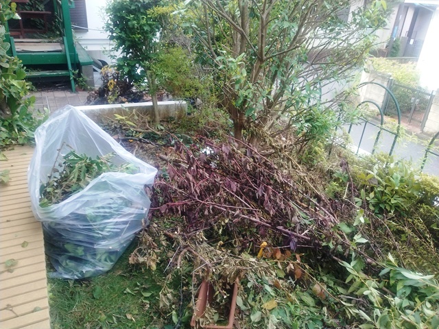 5時半に目が覚めて、外はまだ雨が降っていなかったので、今朝は昨日切り倒したスモモや名も知れぬ木の枝を払う仕事を始める。長ズボンだけ履いたら、半袖から出る腕には虫よけスプレーを振りかけて、剪定ばさみでチョキンチョキンと丹念に枝を払っていく。30分ほどしたら90㍑のビニール袋が一杯になったから、雨が降っても好いように、ウッドデッキに置いておくのでした。女将も起き出して朝食の支度を始めたから、すぐに食事にありつけたのです。