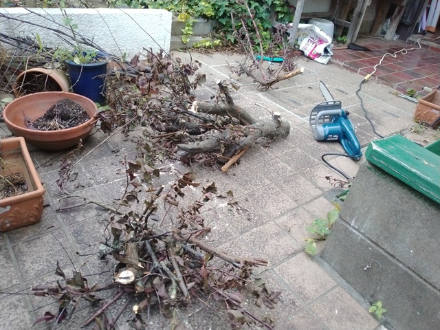 夕べは早く床に就いたけれどなかなか眠れなかった。しかし今朝は5時前に目覚めたから、朝飯前のひと仕事が予定通りに出来たのです。睡眠不足で動けるかと心配したけれど、家の中の倉庫からチェンソーや延長コードを取り出して、玄関前に並べるのです。太さが5cm以上あるスモモの木を、90㍑のゴミ袋に入る大きさに切っていくのですが、これがなかなか難しい。ウッドデッキの階段に腰を下ろして、安定させてからでないとチェンソーの刃が入らない。