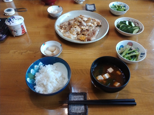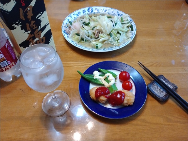 夕方になっても女将がお使いに行きそうにないので、彼女の仕事部屋を覗いて見れば、「夜は何を食べましょうかね?」と車で買い物に行きたそうなのでした。そう言えば、家の冷蔵庫にはもう肉の類はなくなっていたのです。二人で隣町のスーパーに出掛けて、肉や野菜を買って帰る。夕食は亭主がキャベツとモヤシとニラと肉で、野菜炒めを作るのでした。付け合わせに買って帰ったオクラとトマトに亭主の酒のつまみの冷凍唐揚げを出すのです。