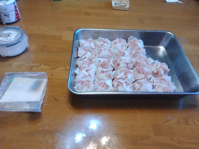 昼は冷やし中華を作って女将と美味しく食べるのでした。満腹感を味わったら眠れるかと思ったら、最近の習慣で、書斎で横になっても眠くならないのが不思議です。仕方がないので、昨日買ってきた挽肉を冷蔵庫から取り出して、玉葱を刻み、挽肉300gと混ぜて、ボールに入れ、胡麻油と酒、片栗粉と醤油少々を加えてペースト状になるまでかき混ぜる。焼売の皮を用意して包んでいくこと20分。スポーツクラブから帰った女将が夕飯に使ったのがこの焼売です。