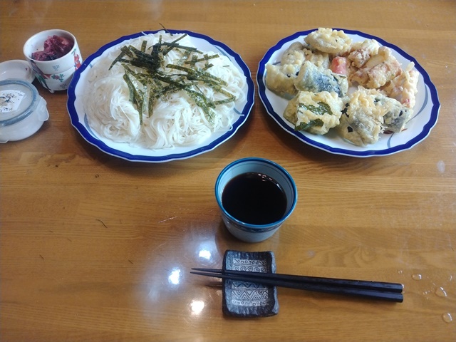 土曜日は子ども達の水泳教室があるかと思っていたけれど、お盆なのでお休みと言うことで、年配の人たちが全コースに散らばっていた。今日も初心者コースに入って、ゆっくりとアップ練習。30分ほど泳いだらもう諦めてプールサイドに上がるのでした。蕎麦屋に寄って天ぷら粉を持って帰り、家で天麩羅を上げて素麺を茹でる。揚げたてだからとても美味しいとは女将の言。天ぷら粉も店で使っていた高級なものだから、カリッと揚がってとても美味しかった。