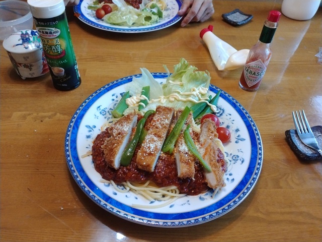 昼は亭主が台所に立って、久し振りにスパゲッティーのベロネーズを作る。買って帰ったトンカツを載せて、栄養満点の昼飯なのでした。満足して昼を食べた後は、すぐに眠くなって書斎でひと眠りするのでした。明日はスポーツクラブがお休みなので、女将の予約もなく、2時間もぐっすりと眠って目覚めたら、午後の一番暑い時間帯なのでした。午後は明日の子ども会の粗大ゴミ回収に向けて、本棚の整理に取りかかるのです。捨てる本は紐で括って玄関に。