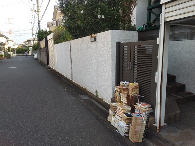 繰り返し階段を上り下りしたせいか、汗ばんできた。今日は朝から少し暑いのでした。本のカバーは紙ゴミの袋に詰めて、ゴミの集積場まで持っていく。1時間ほどで玄関に置いてあった本は、すべて門の前に出し終える。それでもまだ7時まで30分もあったので、エアコンの入った書斎に入って横になるのでした。7時過ぎに食堂に行けば、今朝はカツ煮のご馳走でした。昨日のカツを一枚残しておいたから、十分に腹に溜まって美味しかったのです。