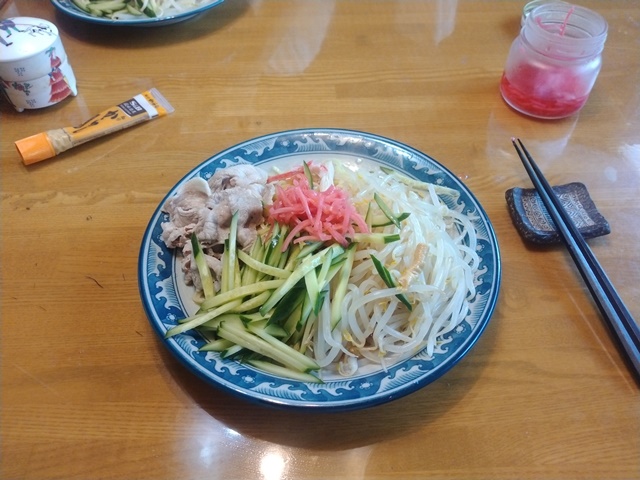 家に帰れば、昨日買い物をして来たばかりなのに、女将が外に出ていた。しばらくして汗だくになって帰って来た女将が、居間の部屋に顔出して「ただいま帰りました」と言う。近くのお茶屋さんに行ったのだけれど、『暑いからお休みします』と張り紙がはられたままなのだそうな。90歳近いお婆さんが一人でやっている店で、長い付き合いなのです。11時になったので、昼は冷やし中華を亭主が作る。卵は今朝食べたから、野菜を多めにして腹が膨れた。