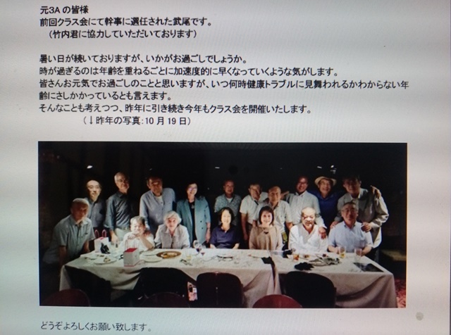 目覚めてパソコンに向かえば、クラス会の案内のメールが去年の写真入りで届いていた。早速、参加の申し込みをして、蕎麦屋の食材のオーダー以外にはあまり使わなかったLINEの登録も済ませたのです。考えたら高校のクラス会も年々参加者が減っている。今年は初めて日曜日の昼の開催で、皆さん少しは暇になったのかな。かく言う自分も、蕎麦屋の営業もなく本当に隠居の生活になるから、1年振りに電車に乗って新橋まで出掛けようと思うのです。