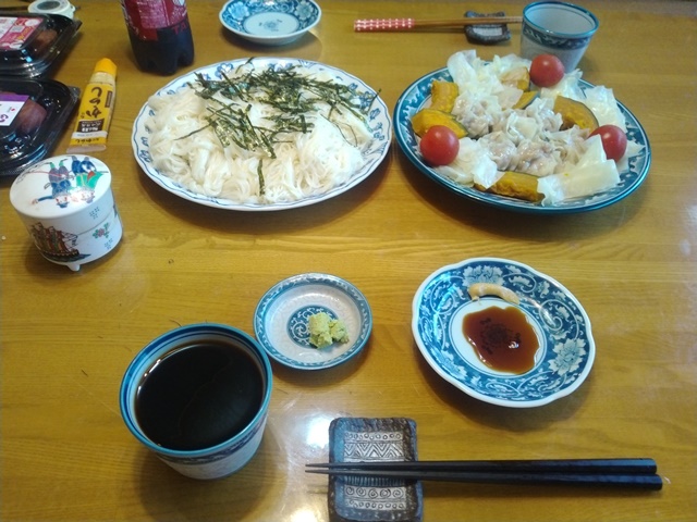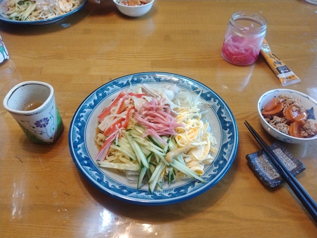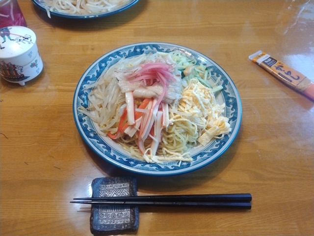 10時にはもう家に帰って、汗をかいたので下着を替え、ハーフパンツとTシャツ姿になって涼むのでした。女将が冷たい蕎麦茶を作っておいてくれたので、水分も補給する。11時になったら台所に入って、昼食の準備をするのでした。亭主の腰痛を心配して女将が水の入った鍋を火にかけてくれていた。キュウリも焼いた卵も刻んでくれて、亭主はモヤシを茹で肉を茹で麺を茹でて盛り付けるだけ。9月の第二週でも冷やし中華が美味しいのは暑さのお蔭です。