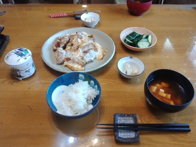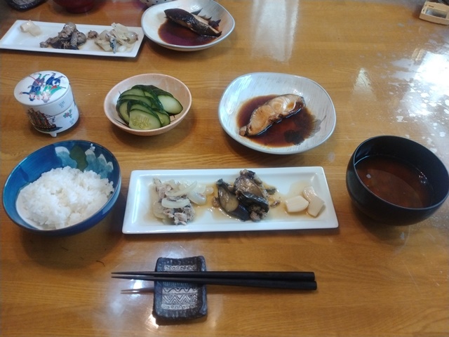 今日の朝飯前のひと仕事は、昨日のうちにチェンソーを使って細かく切ったウチワサボテンの枝を、燃えるゴミの袋に詰めて行く作業でした。葉の部分は既にもう捨てたのですが、軒下まで伸びていた枝や幹は、なんとゴミ袋四杯分にもなって、とても重いのです。まる一時間かかってやっと詰め終えたところで、朝食の時間になったので食堂に行けば、女将がおかずを作ってくれて「パンは自分で焼いてください」と言われた。魚焼き器で5分掛けて焼く。