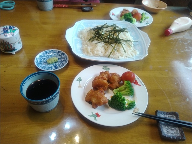 昼の時間になったので家に帰って素麺を茹でる。女将がブロッコリーを茹でてくれて、亭主は冷凍の唐揚げをチーンするだけ。午後は昼寝もせずに切れた電話の戦の修復を試みるが、目が悪くなったのか細い線が見えないのです。女将のスポーツクラブの予約をおえたら、ガソリンスタンドに行って給油をしてから、一緒に買い物をすると言った弟の所へ行くのでした。二人でイオンモールに出掛けて、お袋様の誕生日会の料理を買って帰るのです。