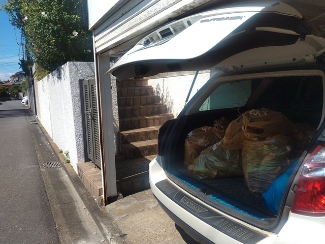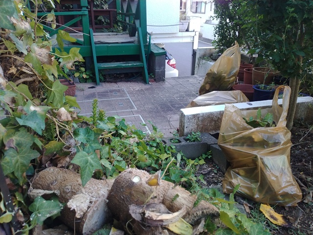 集積場に袋を並べていたら、向かいの家のお婆さんが出て来て、「今日は何のゴミを出す日なのでしょうかね?」と亭主に尋ねる。「プラゴミと埋め立てゴミの日ですよ」と応えて、丁寧に中身を説明してやる。車の荷台が空いたから、今度は先週切り倒したウチワサボテンの葉を、庭の片隅から蕎麦屋まで運ぶ。これはゴミ回収の業者に持っていってもらうのです。瀬戸物よりもずっと重いから運ぶのも大変。昨日痛めた腰を庇いながら、所定の場所に運んだ。