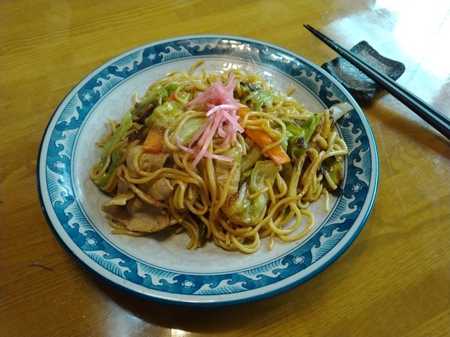 昼飯の時間になるので家に帰って食事の用意を始めます。女将が野菜を切ってくれて、亭主はフライパンで炒めるだけの今日は焼きそばです。焼きそばは単品で買ってきてあったから、味つけはソースのみ。久し振りだったのでこれは美味しかった。キャベツの量は相当に多かったのですが、フライパンに蓋をして蒸す形で調理すれば、ほんの少しの量になってしまう。鶏ガラスープの素を切らしていたので、野菜とソースの味で我慢するのでした。