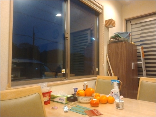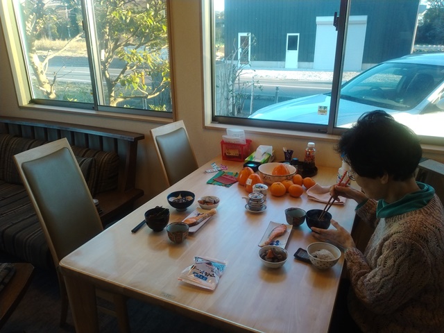 5時前に目が覚めて、今日は6時間は眠っていないなと思った。それでもいつもの習慣で、居間の部屋に行ってコーヒーを淹れてから、窓のブラインドを開ける。まだ真っ暗なのでした。昨日よりも暖かく、部屋の温度は15℃もあった。6時半を過ぎてもまだ陽は昇らない。東の空の雲が朝日を浴びて赤く染まってくる。女将が起き出して、朝食の支度を始める。亭主は箸や小鉢や味噌汁をテーブルまで運んで、黒豆ご飯をチーンしている。朝食の始まりです。
