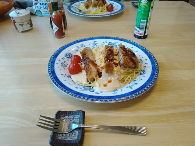 空いているコースへ入ってマイペースで泳げば、気持ちの好いことこの上なしなのです。身体も温まって家に帰れば、ちょうど11時前で一服してから昼食の支度を始める。揚げたてのトンカツを買って来ておいたから、スパゲッティーを茹でてカルボナーラのソースを温め、トマトを添えて出来上がりです。値段は高いけれどこのソースはとても美味しい。陳列棚にもこのソースの所だけが品数が減っていたから、きっと人気があるのかも知れない。