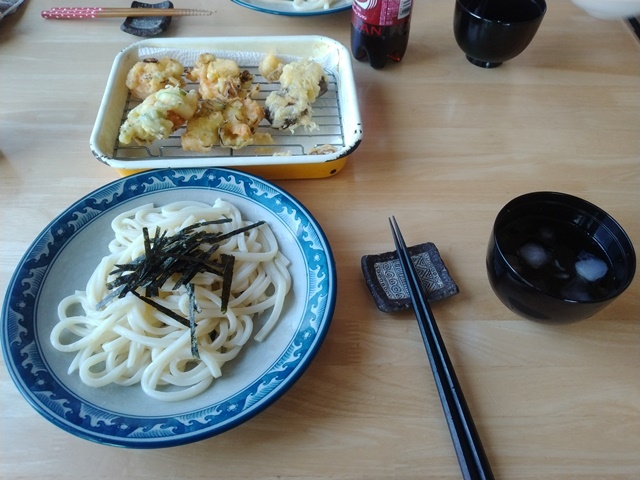 10時半になったので、そろそろ昼の支度を始めなければ。向かいのサツマイモ農園では、新しく出来た事務所の周りに砂利を敷く作業が始まっていた。トラックの後ろの荷台がゴーンゴーンと音を立てて砂利を落としていく。女将は今日も買い物に出掛けて、牛乳や生シイタケを買ってきた。天麩羅鍋に油を注いで、天ぷら粉をボールに入れたら、ガスコンロの火を点けてシイタケを入れる。そして水でもどしたむきえびとイカと刻んだ葱を揚げてうどんを茹でる。