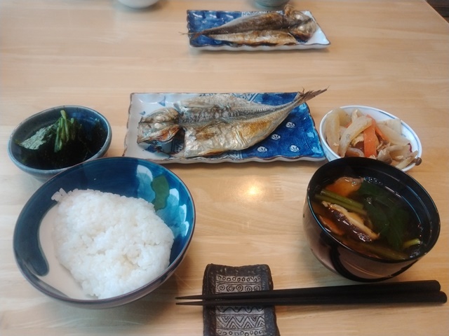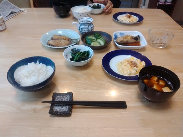 7時前に女将が厨房に入って朝食の支度を始める。亭主はそれまでに新聞を取ってきてひと通り目を通すのです。箸や小鉢をテーブルまで運び、後は魚が煮えるのを待つだけ。煮えた魚と豚汁は女将がカウンターの上に置いてくれるから、テーブルまで運ぶのです。最後の黒豆ご飯もごま塩をかけて美味しく頂くのでした。銀ダラの煮付けと豚汁も亭主の好物だから、箸を休める暇もない。食べ終えたら食器を重ねて流しに運ぶのです。後はお茶をもらってお終い。