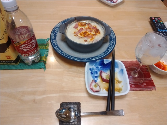 厨房に入っていた女将に今日の夕食は何かと聞けば、「グラタンが食べたいと言っていたじゃない」と言うので、久々にグラタンが食べられると喜んだ。4時をとうに過ぎていたから、箸と焼酎、炭酸を用意して、グラスに氷を入れて晩酌の準備をするのです。白菜のキムチを小鉢に盛り付け大相撲を観ていれば、女将が蛸の刺身を出してくれた。そして、いよいよグラタンが焼き上がり、美味しい夕食が始まるのでした。大相撲は大関が二人とも負けて横綱も負けたので、ちょっとがっかりした結末なのでした。