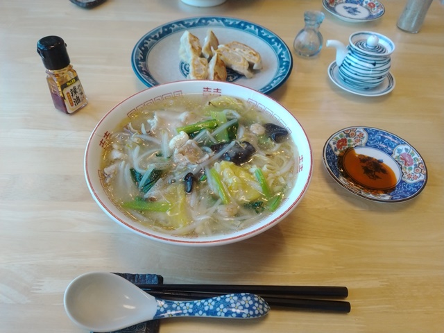 厨房に入ってまず大釜に水を汲んで火にかけ、野菜や海鮮ミックスやキクラゲ、シメジなどを準備して、中華鍋に油を引いて肉から炒めていく。すべての食材を炒め終わったら、水を入れてしばらく煮るのです。白菜が柔らかくなった頃に、鶏ガラスープの素と砂糖を入れ水溶き片栗粉を少しずつ流し込んであんかけを作る。中華鍋を後ろのコンロに移して、ガラスのふた付きのフライパンで餃子を焼いたら湯を入れて蒸す。麺が茹だったら完成なのです。