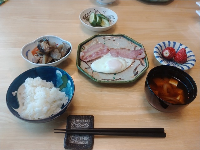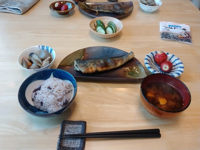 朝食のおかずはほっけと煮物だったから、赤飯を温めて美味しく頂くのでした。香りの好い苺がついて満足な朝ご飯なのです。女将の朝ドラの時間帯には亭主も椅子に座って静かにしている。その後は朝の写真をブログに載せて、正月に友人が贈ってくれた自撮りの写真をしみじみと眺め、やっと洗面と着替えを済ませるのでした。プールの支度をし終えたら、コーヒーカップに残った冷めた珈琲をすすりながら、今日の昼食には何を作ろうかと考えるのです。