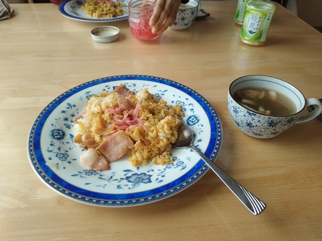 1時間ほどで終わったけれど、家に帰ればもういつもの昼食の時間なのでした。二人とも少しはきちんとした恰好で出掛けたので、普段着に着替えて亭主は厨房に入る。朝が忙しなかった女将は、カウンターの前で立ちながら新聞を読んでいた。昼はカレー炒飯にすることになっていたので、食材を揃えてテフロンのフライパンで具材を炒めて、チーンしたご飯を入れて最後に塩とカレーとを加えて出来上がり。ラーメンスープの素に肉や葱を入れてスープを作る。