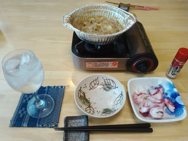 4時を過ぎていたから、亭主は晩酌の用意をして、プールの帰りに買ったモツ鍋の冷凍を取り出してコンロにかける。焼酎と炭酸と氷を満たしたワイングラスを用意して、女将が蛸を切ってくれるのを待つ。今宵もすべて酒のつまみ。モツ鍋は初めてだからちょつと不安もあったけれど、ガスを点ければ自然と氷が溶けて鍋の様相を呈してきたのです。蛸をつまみながら煮えるのを待てば、水分が増えて鍋らしくなってきた。美味しさはともあれつまみにはなる。