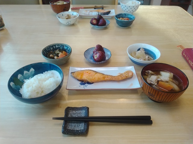 7時前に女将が厨房に入って、本を読んでいた亭主も小鉢を盛り付けたり、テーブルに皿を運んだりと手伝うのです。豚汁は里芋が甘くて美味しい。鮭も脂が乗っていてとても美味しいのでした。女将の朝ドラの時間に奥の寝室に入ってベッドに横になったら、ウトウトとして1時間ほど眠ったのだろうか。目覚めればもうプールへ行く時間なのでした。車に乗り込めば車外温度は4℃とかなり暖かい。みずき通りを下れば青空が広がっているのです。