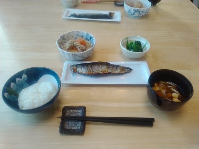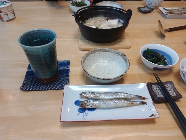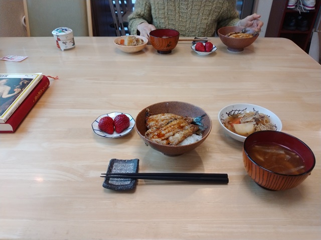 女将が厨房に入ったので読書は終わり。亭主は新聞を取りに玄関を出て、箸を取りに厨房に行く。小鉢と味噌汁の豚汁をテーブルに運べば、後は女将が鰯の蒲焼きを持って席に着くのです。蒲焼きのタレが今日はしっかりととろみが出ていて美味しそうだった。豚汁は具が多すぎて汁が少ないから、煮物を食べているような感じなのでした。二人だけだと味噌汁も作るのが難しいらしい。今日は亭主が眼科に行くから、食後は急いで洗面と着替えを済ませるのです。