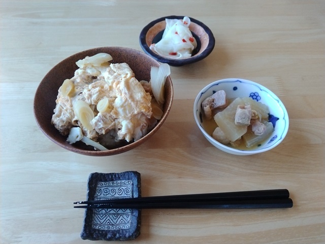 昼の支度の時間になったから、厨房に入って昨日の残りのトンカツを処理することにして、葱と卵でカツとじにしてミニカツ丼を作ろうと思ったのです。女将も手伝いに来てくれて、煮物などの小鉢を用意してくれた。眼科の話をしたのだけれど、人ごとのように聞いて、彼女も老眼だから近くはメガネを外して見るのだと言う。亭主の場合は遠近両用のメガネでもぼやけ、眼鏡を外してもぼやけて文字が見えないから困っているのです。医者にもそれが判らない。